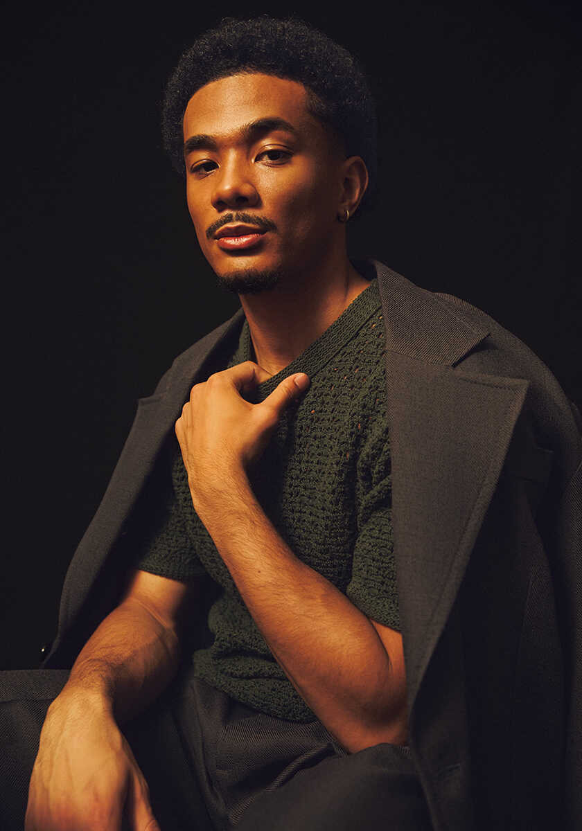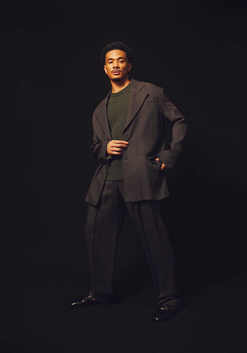ジャケット48万9500円、ニットTシャツ19万3000円、パンツ19万3000円、シューズ17万6000円(以上ボッテガ・ヴェネタ/ボッテガ・ヴェネタ ジャパン)