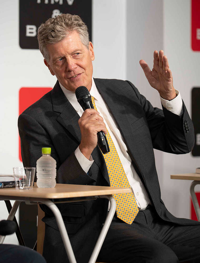 イベントの数日後に初日を迎える『エリザベート』の劇中音楽が流れる中、50人の熱烈なリーヴァイファンの拍手により、いよいよイベントがスタート。トークショーには、シルヴェスター・リーヴァイ、著者のカール・ホーエンローエ、日本語版の翻訳を担当された大井の3人が笑顔で登場。