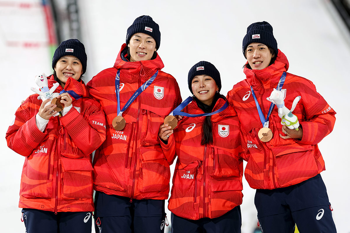 スキージャンプ混合団体チームが銅メダルを獲得したときの写真。丸山選手と二階堂選手が手にしているのがミラノ・コルティナ冬季オリンピックのマスコット。なんの動物だかわかる? 細長いカラダをしていることから、フェレットだと思う? 答えはNO! では、イタチ? 惜しい! このマスコットはオコジョという山間部に生息するイタチ科の動物で、イタリア人にとっては身近な動物なのだとか。