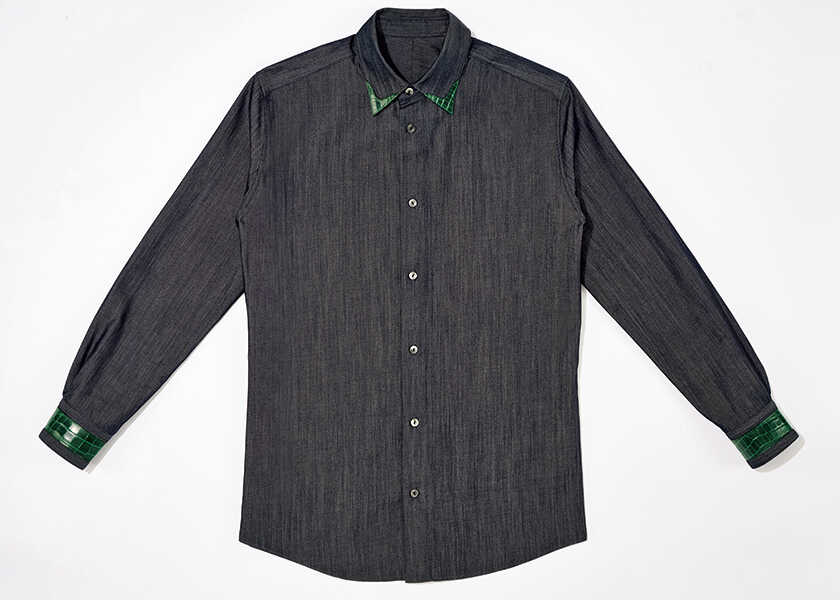 シルク混のデニムボディにクロコダイルレザーを襟元やカフスに贅沢にあしらった、ラグジュアリーな1着。ブラック、キプロス(グリーン)、ロイヤルブルーの3色展開。14万800円(ジーフランコ)