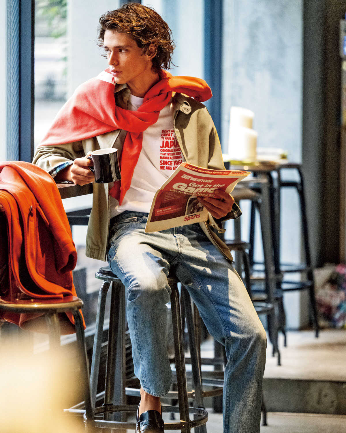 スウィングトップ1万9800円、Tシャツ6600円、デニムパンツ1万7600円、テーブルに置いたダッフルコート7万9200円(以上エドウイン/エドウイン・カスタマーサービス)、肩にかけたスウェット1万7600円(ジャクソンマティス/ヒラクPR)、ローファー5万600円(セバゴ/トヨダトレーディング プレスルーム)、その他はスタイリスト私物