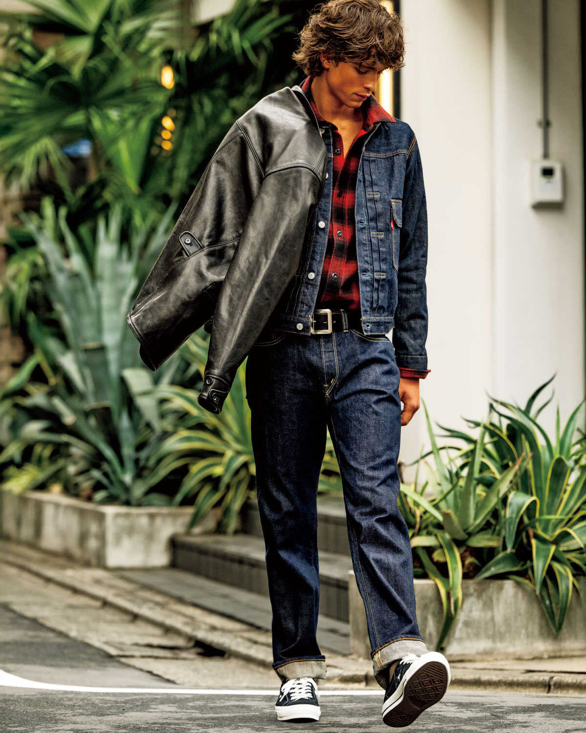 デニムジャケット2万4200円、チェックシャツ2万5300円、デニムパンツ1万5400円、レザーベルト1万3200円、レザーカーコート13万2000円(以上エドウイン/エドウイン・カスタマーサービス)、スニーカー1万5400円(コンバース/コンバースインフォメーションセンター)、その他はスタイリスト私物