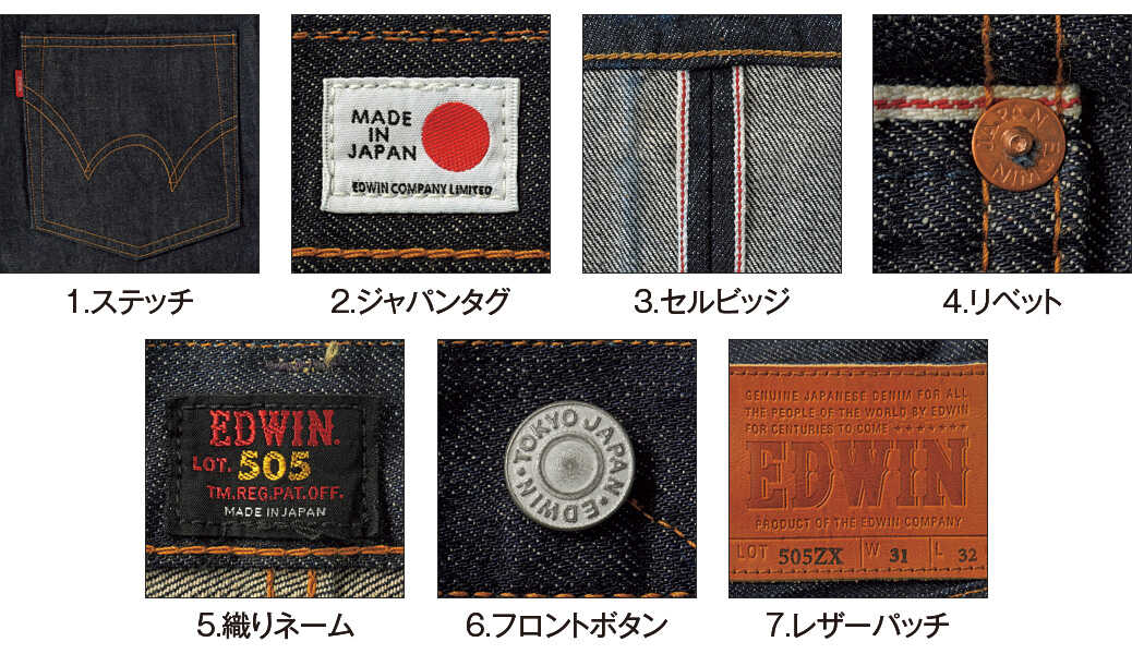 1:それぞれ参考にした時代の縫製の特徴に倣って縫い分け 2:日の丸入りのタグは、日本製である貴重な証し 3:セルビッジ付きで、生地へのこだわりも強い。シャトル織機の名機“トヨG9”を用いたことで独自のムラっけも楽しめる 4:作業着だった歴史を示すリベットにもロゴを刻印 5:“505”とはモデル名ではなくロットナンバー 6:“東京発”を表す刻印ももちろん健在 7:紙パッチが主流の現代に、贅沢にレザーパッチにこだわった