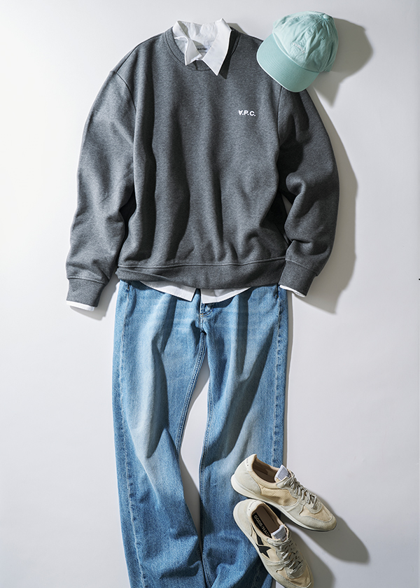 スウェットに薄青デニムという平凡なアメカジになりそうな格好で、シャツの襟と裾、そして袖口を出すのがポイント。これだけで抜け感が生まれ、大人のアメカジに!