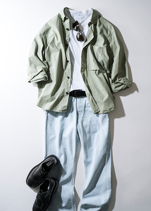 シャツと薄青デニムの合わせも、普通に着ると悪くはないけど、なんの変哲もない印象に。それが、袖をガッと捲ってガバ開けで着れば、いい感じのワイルドさに。男らしくて肩の力が抜けたシャツデニが完成!