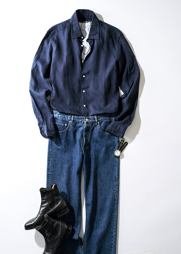 シャツ6万2700円(スローウエアグランシャツ/コロネット)、タンクトップ9900円(RHCロンハーマン)、デニムパンツ3万5200円(アー・ぺー・セー/アー・ぺー・セーカスタマーサービス)、ネックレス12万9500円(トムウッド/トムウッド青山店)、腕時計68万5300円(チューダー/日本ロレックス/チューダー)、ブーツ19万8000円(ジェイエムウエストン/ジェイエムウエストン青山店)