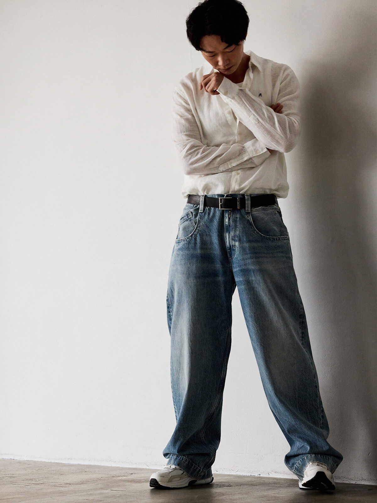 全体にゆとりを持たせたバギーシルエットのデニム“フェリーズ”。淡青のミッドブリーチウォッシュがヴィンテージライクな風合いを作り出し、裾のたまり具合さえも着こなしの味になる。特大バックポケットが映えるバックスタイルも印象的で、白シャツをさらりと合わせるだけで絵になる着こなしが完成する。「これは今の自分に一番近いスタイル。シルエットもまとまりやすいし、靴に裾が少したまっている感じも格好いい。ゆとりがあるからラクに穿けるし、なにを合わせてもいい。ジャケットも合いそうだし、靴をローファーにしてもよさそう。汎用性が高いからこそ日常にすっと馴染んでくれる。そんな服ですね」と笠松さん。