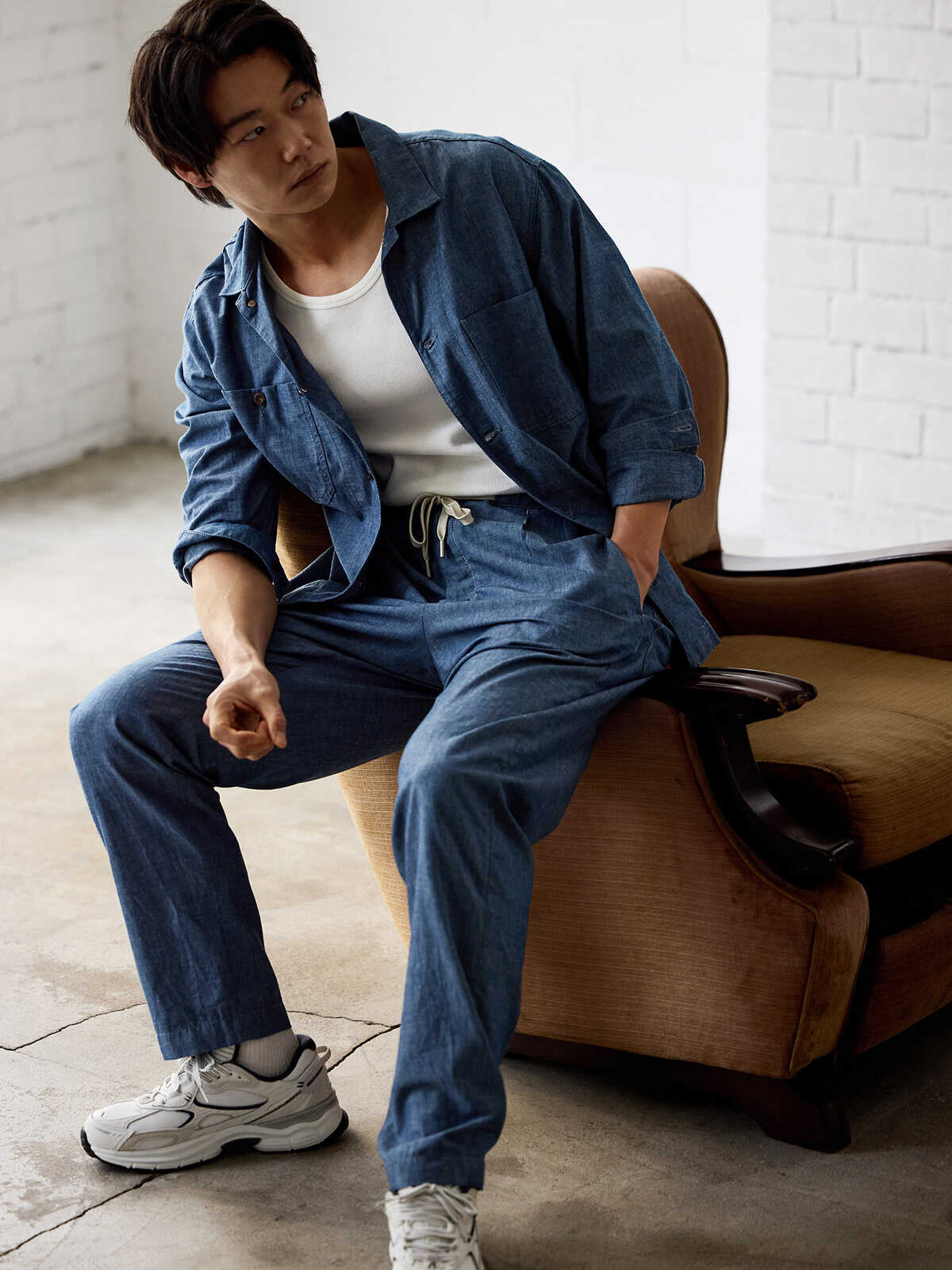 コットンリネンのシャンブレー素材で仕立てたイージーパンツと、共地のシャツジャケットと合わせた、カジュアルなセットアップスタイル。肌離れのよい生地は初夏の装いとしても心地よく、着心地もとびきり軽やかだ。笠松さんも「生地がさらっとしていて、シルエット的にもすごく着やすい。あれこれ考えずユニフォームのように着られるところが魅力ですね」と気に入った様子。また「こういう服は、小物やアクセサリー次第で全く違った表情を見せてくれる。夏だったら、ビーチサンダルを合わせて、ネックレスやブレスレットを足してみるような着こなしも格好いいかなって思います」と上級者らしいコメントも。