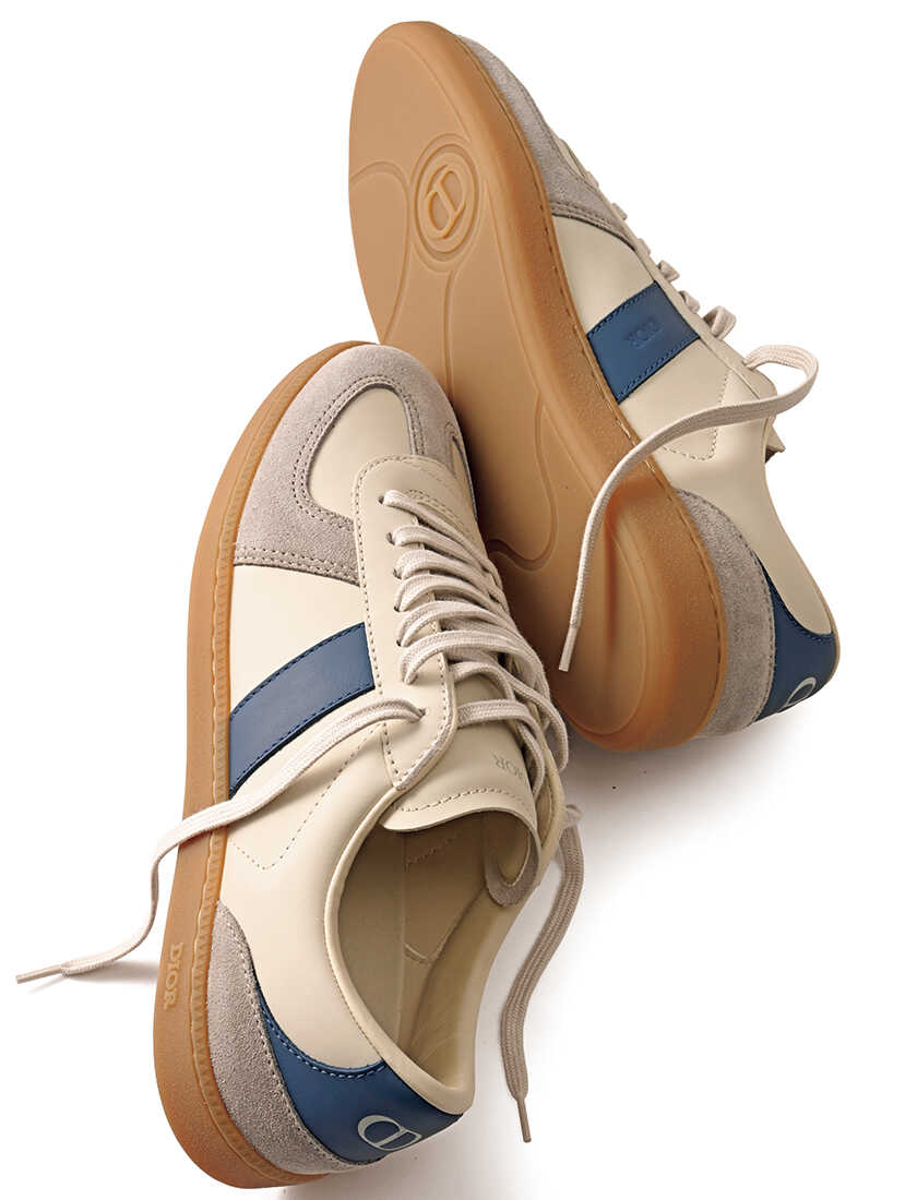 ならば、そんな時代に一体なにを選ぶべきか? こたえのひとつが〈ディオール〉のスニーカー、その名も“B01マッチポイント”の新色だ。2004年に登場した名作“B01”のレトロなトレーナースタイルはそのままに、モダンかつエレガントなシルエットに再構築。柔らかな白のスムースレザーをベースに、褪せブルーのレザーとグレーのスウェードを配した面構えは、大人にふさわしい上品スポーティ。爽やかさと落ち着きを兼ね備え、人生後半戦のお洒落マッチポイントもあざやかに決められるかと!10月30日(木)発売予定。13万5000円(ディオール/クリスチャン ディオール)