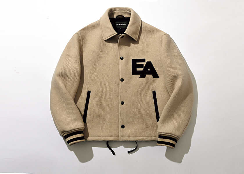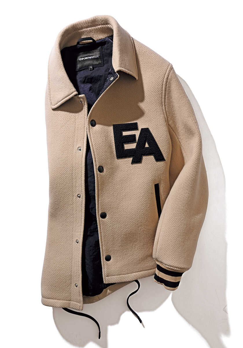 生地は表情ある編み模様が特徴のウール素材を使用。ブランドイニシャルである“EA”をモチーフにしたワッペンや袖のライン使いなどカレッジライクなデザインだが、落ち着いた色味だから小僧感もない。13万7500円(エンポリオ アルマーニ/ジョルジオ アルマーニ ジャパン)