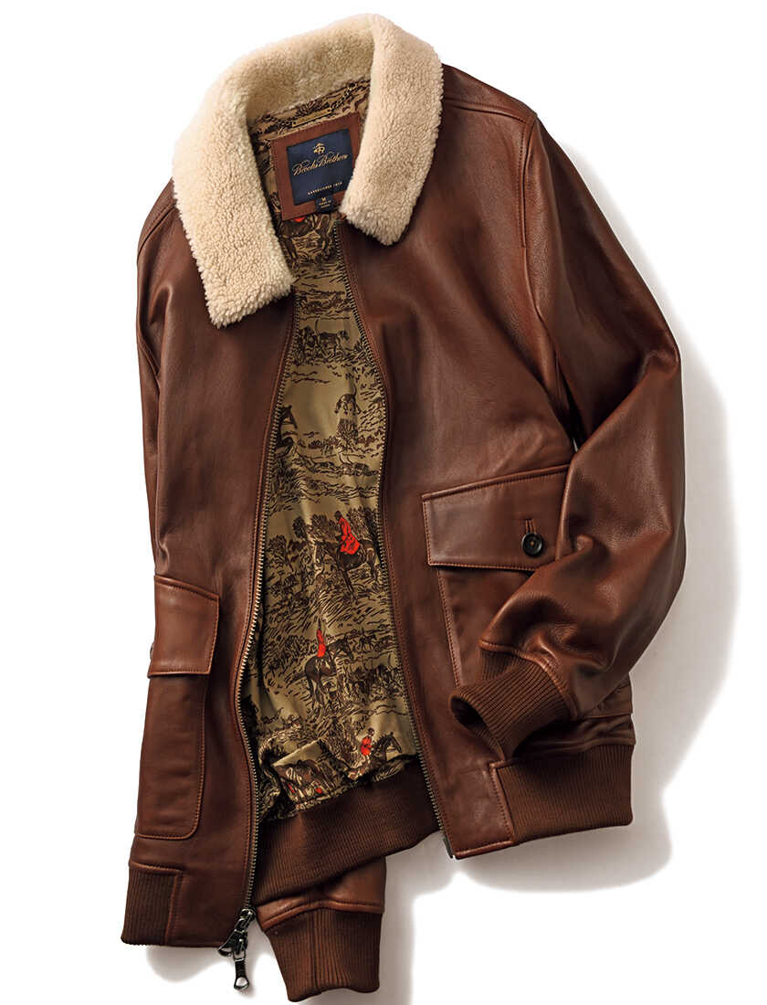 とはいえ、ティモシーのように“演じ分ける”のは難しい。だけど、この〈ブルックス ブラザーズ〉のブルゾンがあれば、誰でもさりげなく“意外性”を身にまとうことができる。見た目はシンプルかつ男前。しかし、裏地には馬が悠々と走っていて上品! 少し肌寒いビーチで羽織ったとき。ホテルのラウンジで、そっと脱いだとき。ちらりと見える裏地が想定外でしょ!? 見えないところに仕込んだ“意外性”は、自分の気分まで高めてくれる。ティモシーのような演技力がなくても、この1着で“ギャップのある男”に一歩近づけるかも!?ファスナーを閉じれば襟元のボアが映える正統派スタイル。裏地には遊び心が隠れているギャップが魅力!