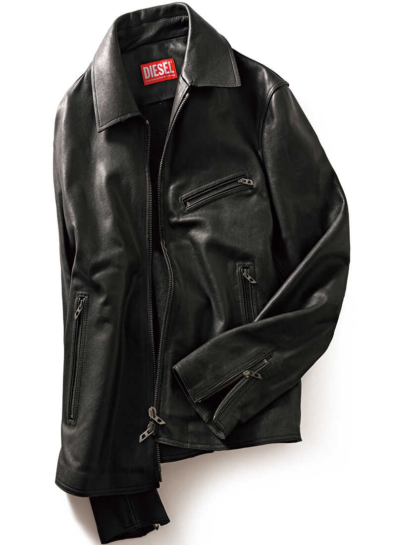 秋といえば、レザーの出番が増える季節。であれば、レザー好きが多いハリウッドセレブを参考にしようと彼らの着こなしを見てみると、襟付きシングルライダースの着用者が多いことに気づく。このタイプのライダースは、襟型がレギュラーカラーなので、ダブルライダースほどワイルド見えしないのがいいところ。シックな装いにも合わせやすく、使い勝手のよさはピカイチだ。それでいて、男らしさもしっかり印象づけられるのだから、大人セレブに選ばれて当然といえば当然かと。そんなシングルライダースで、ほかとは違うお洒落を楽しませてくれるのが、〈ディーゼル〉が手掛けたこちらの新作。注目してほしいのは、ジッパーすべての引き手。よ〜く見ると、これがシグネチャーとしてお馴染みのタイニーロゴの形になっている。近距離になったときにだけわかるスマートな遊び心が、なんともニクい。