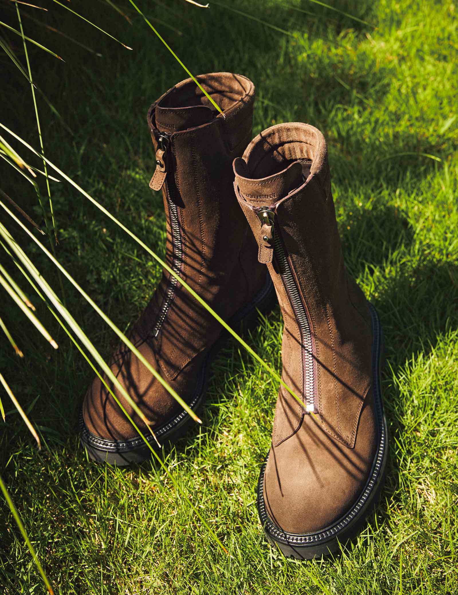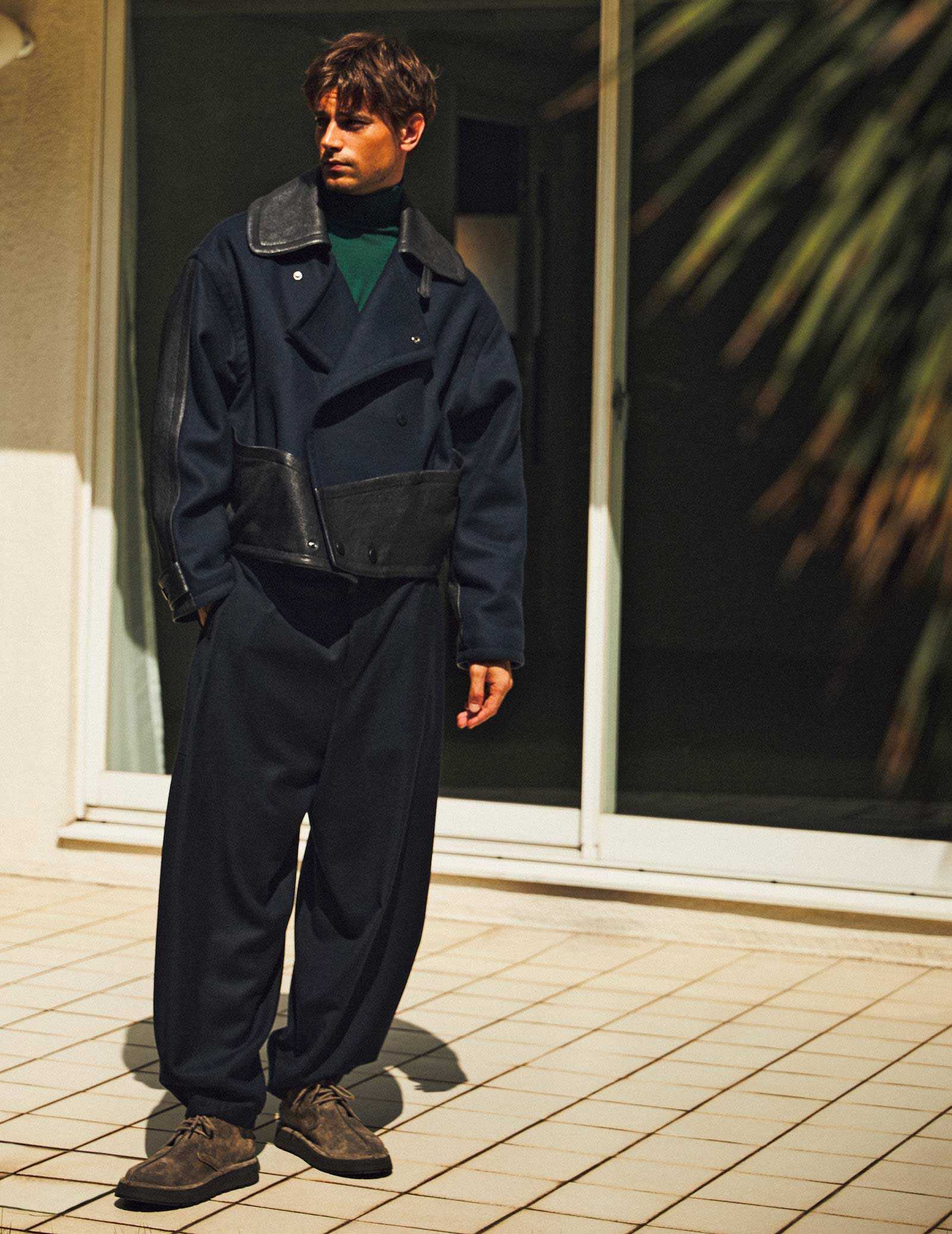 レザーブルゾン104万5000円、ニット26万4000円、パンツ30万8000円、シューズ25万3000円(以上ジョルジオ アルマーニ/ジョルジオ アルマーニ ジャパン)