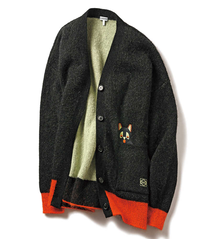 “自由気まま”といえば、猫もそう。この〈ロエベ〉のカーディガンには猫が潜んでいてポケットからひょっこりと顔をのぞかせている。描かれているのは猫好きで知られる画家のルイス・ウェインによる陶芸作品の猫。イタズラな顔をして、こちらをじっと窺うようにも、今にも飛び出しそうにも見える。そんな心くすぐるデザイン性に加え、モヘアだから手触りがよく保温性もいい。風が冷たい夕方にもおすすめ。猫に頬をすり寄せたような温かみに心まであったかくなりそう⁉