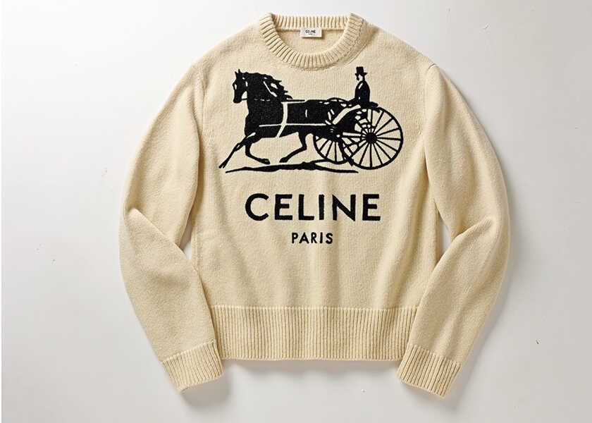 そして、原点に立ち返るというテーマに通ずるのが、〈セリーヌ〉で見つけたこちらのニット。エディ・スリマンからマイケル・ライダーにバトンタッチした初のコレクションからの1着は、大胆なフロントロゴが目印。、〈セリーヌ〉といえば、いまやトリオンフがアイコン。だけど、こちらには懐かしのサルキー(2輪馬車)が入っている。このロゴは、2000年代以前に使われていたもの。それをフロントに大きくあしらうことで、キャッチーでアイコニックなデザインに。まさにブランドの“原点に立ち返る”ような1着になっている。