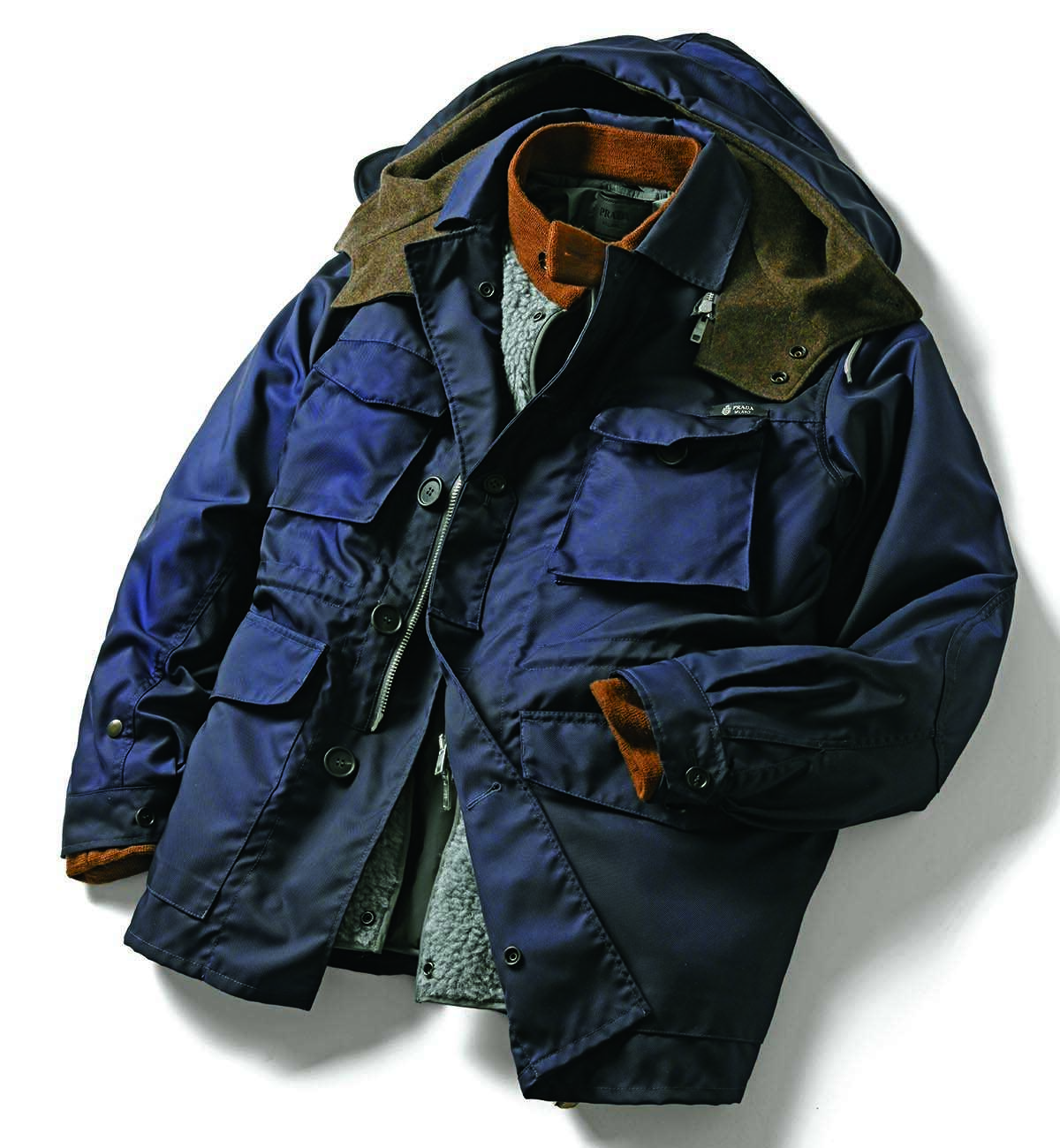そんなことがなくとも、大人のギャップを見事に演出できるアイテムが〈プラダ〉にあったので紹介したい。一見、武骨なマウンテンパーカ。だけど中には、襟元と袖元のかわいらしいブラウンが効いたグレーのフリースが。たとえば、真冬の寒さ厳しい散歩道。男らしいシェルで風を切り、クールに歩く。でもカフェに立ち寄ると、さっとそれを取り外し、優しいフリース姿に変身する。これこそまさに、大人のさりげなギャップ。映画のようなワンシーンがはじまりそうじゃない!?
