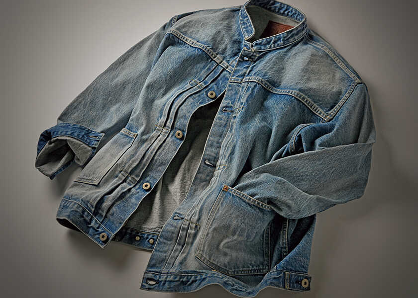 今回紹介したいのは、そんなセレブたちも“その手があったか!” と思わず膝を打ってしまうに違いない1着。〈ザ・ダファー・オブ・セントジョージ〉の新作トラッカージャケットがそれだ。いい感じに味の出たGジャンなのだが、注目したいのは襟元。そう、襟型がまさかの立ち襟なのだ。いわゆる普通のレギュラーカラーじゃないところに遊び心が感じられるし、首まわりがすっきりすることで視覚的な抜け感も出せてしまう。加えて、さらなる特筆ポイントといえるのが、デニム自体の“味”。ヴィンテージのトラックジャケットの魅力をあの手この手で再現した労作だけあって、生地も加工もこだわり満載。ヴィンテージと同じように凹凸感のある織りを採用しているので、糸のかたまりのような白いフシがランダムに現れている。縦方向のムラが強い色落ちもまた、年代物のGジャンを思わせる味わい深さ。そんな違いのわかる大人も納得の“味”を楽しみながら、絶妙な“スキ”を魅力的にアピールできる1着。