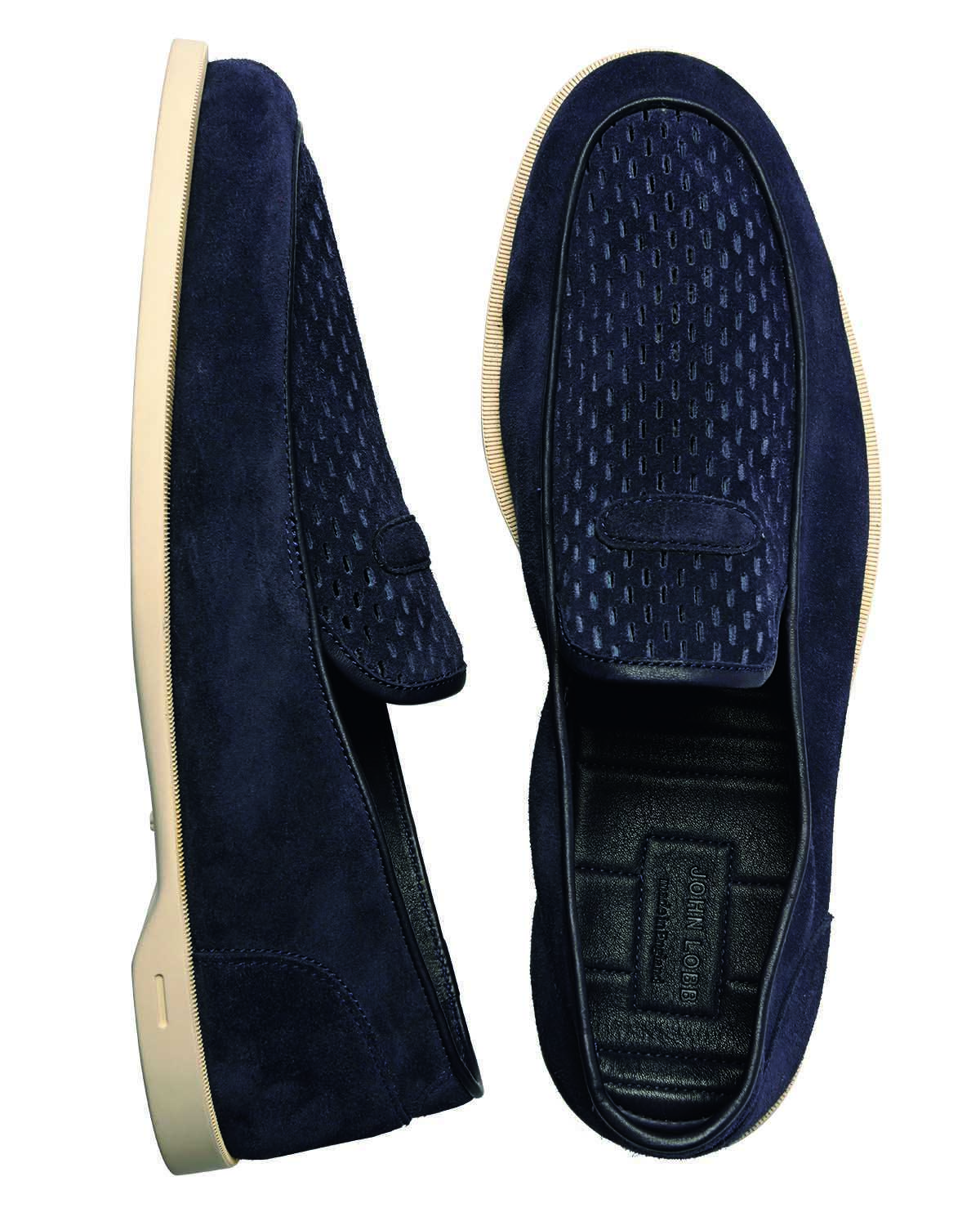 上:こちらがもう1色のネイビー。ぐっと都会的で洗練された印象に。15万9500円(ジョンロブ/ジョン ロブ ジャパン) 下:ローファーで靴擦れした苦い思い出も一気に吹き飛ばすほどの柔らかさ