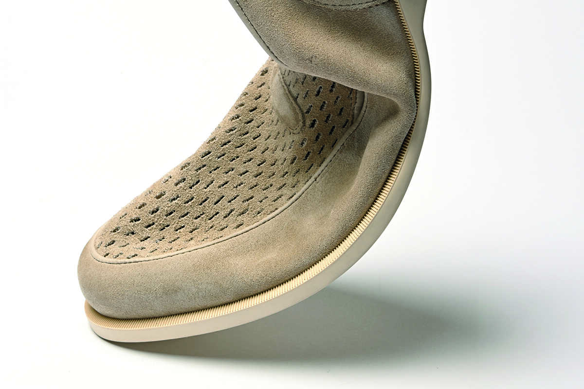 思わず触りたくなるソフトな122MARCH 2026スウェードに、甲のパンチングが、海に映える抜け感をプラス。淡青デニムの格上げに、もしくはショーツに合わせても難なくハマる。15万9500円(ジョンロブ/ジョン ロブ ジャパン)
