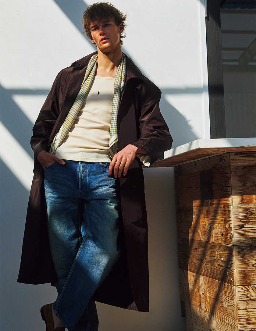 コート77万7700円、タンクトップ10万3400円、デニムパンツ17万7100円、スカーフ8 万300円、シューズ18万7000円(以上サンローラン バイ アンソニー・ヴァカレロ/サンローラン クライアントサービス)
