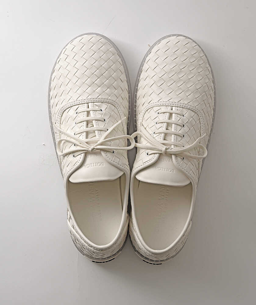 アッパー全体は繊細な〈ボッテガ・ヴェネタ〉を代表する技法“イントレチャート”で表現。ヒールタグとクリア素材のアウトソール裏には左右それぞれ“BOTTEGA VENETA”のブランドネームがあしらわれている。18万1500円(ボッテガ・ヴェネタ/ボッテガ・ヴェネタ ジャパン)