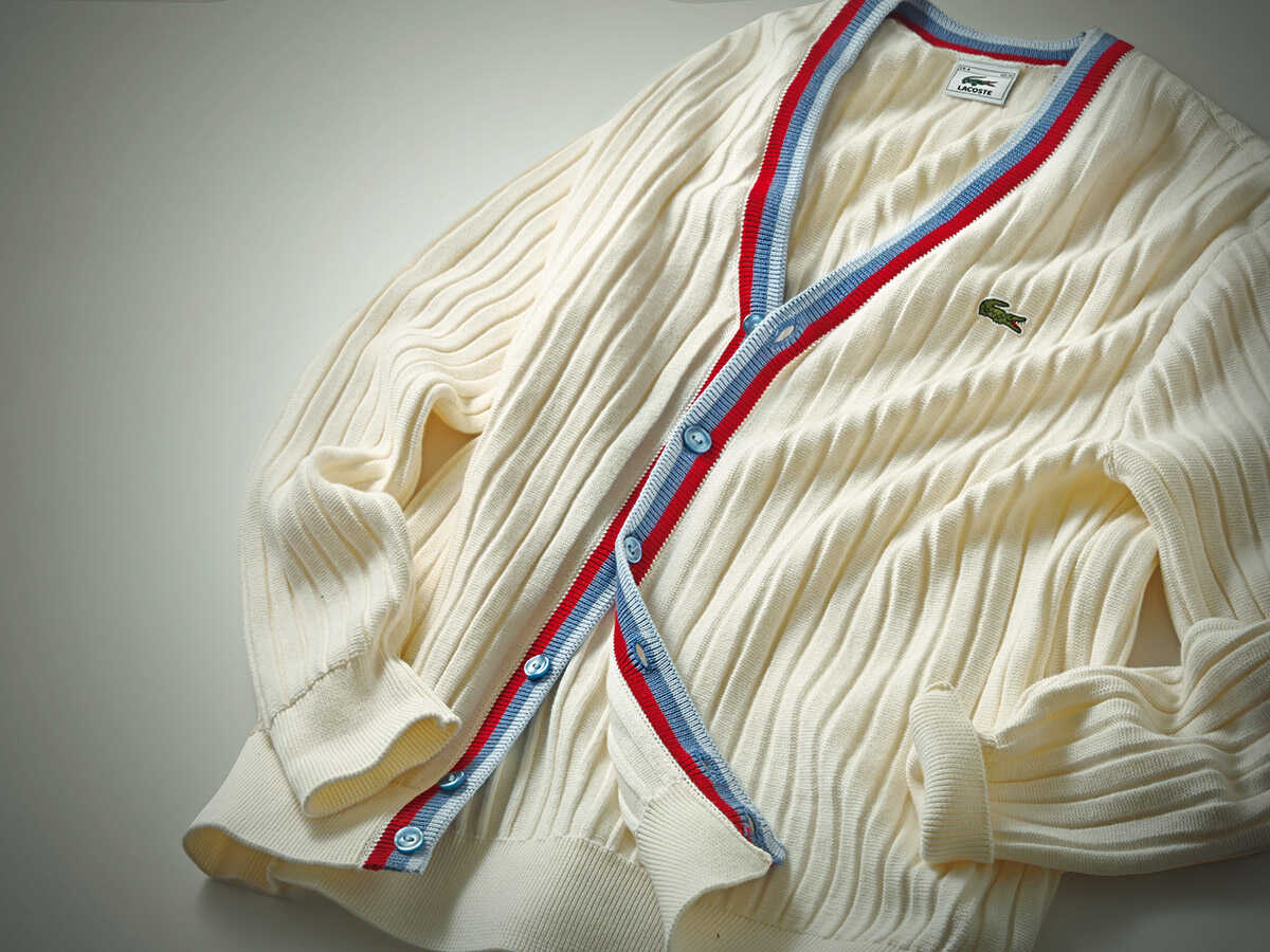 ちょっと毛玉が出ていそうな味のあるカーディガンをダメージデニムに合わせてしまうあのレイドバックしたムードは、西海岸を愛する僕らにとってはたまらないものがある。なので、もはや流行を超越したひとつのスタイルとして、これからも楽しみ続けていくことになるのかと。ただその一方で、ある程度年を重ねたら、それとは別に大人らしいカーディガンの着こなしも楽しめるようになりたいもの。ハリウッドセレブでいうなら、ヨハネス・ヒューブルやジェイコブ・エロルディがやっているような、肩の力を抜きつつも上品見えする着こなし。あのスタイルが理想なのかと。で、そんな理想を叶えるうえで心強い味方になってくれそうなのが、〈ラコステ〉が手掛けたこちらの1着。ブランドのアーカイブを現代的に再解釈したその佇まいは、同社のルーツであるテニスの世界観を感じさせるエレガントかつスポーティなムードが印象的。縦方向に走るリブが品のよさを印象づけてくれる一方、目を