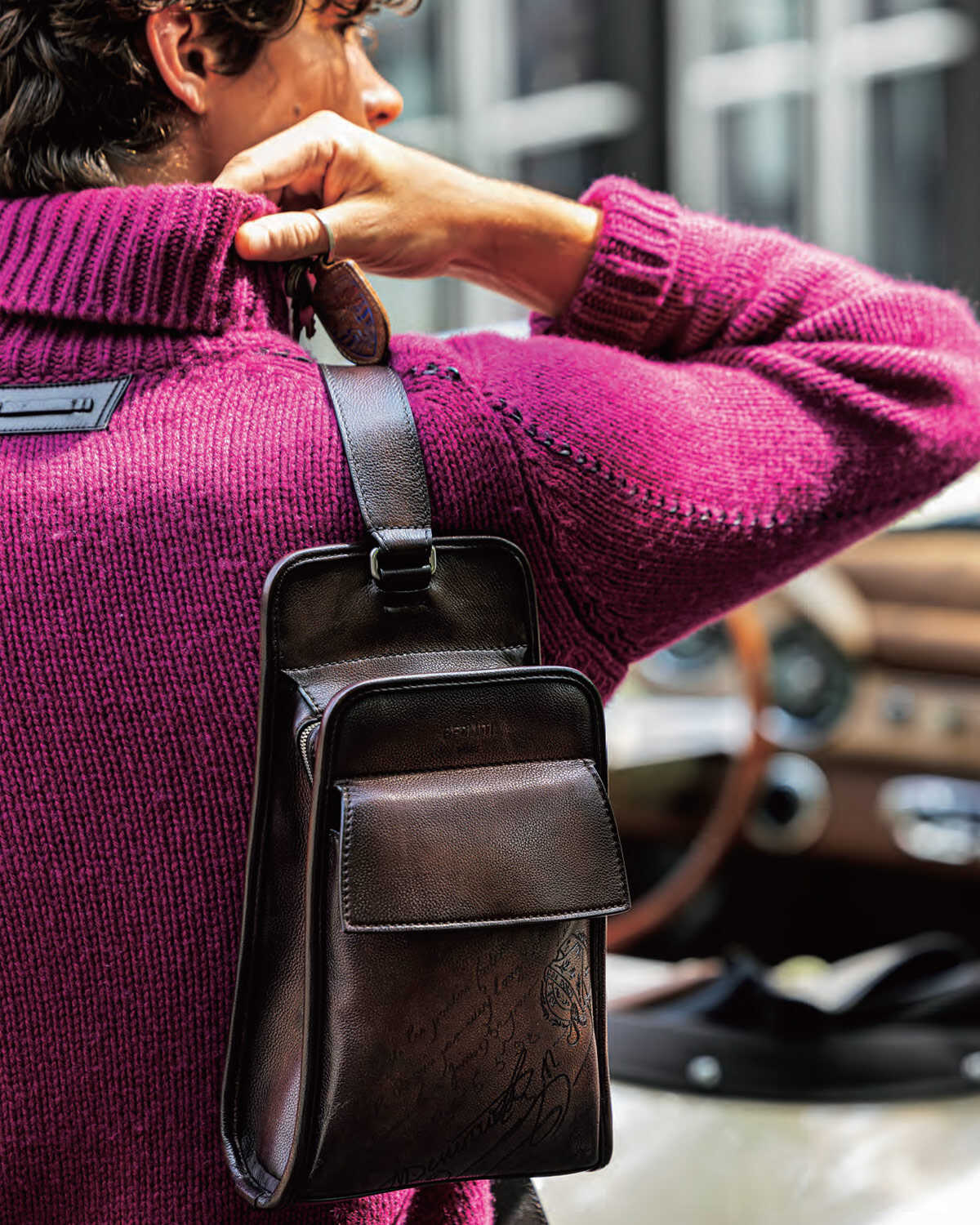 スリングバッグ40万9200円、タートルニット35万2000円(以上ベルルッティ/ベルルッティ・インフォメーション・デスク)、その他はスタイリスト私物