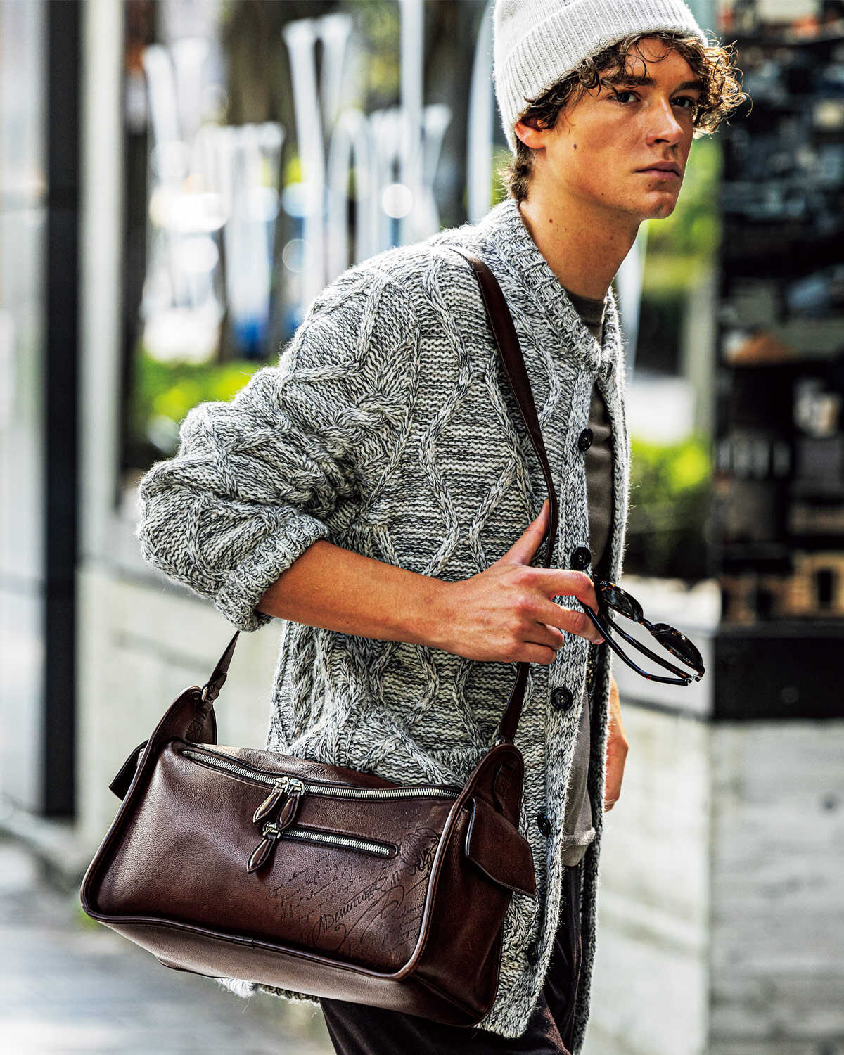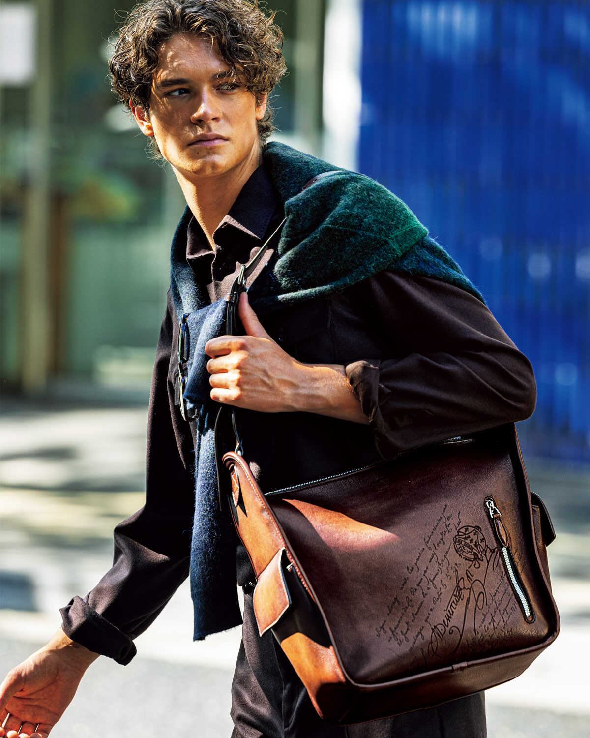 休日を思う存分楽しむ大人には、どんなバッグがふさわしいか? 単に荷物を持ち運ぶだけのツールではなく、装いの品格出しに活用できるデザインで使い勝手もいい、そんなバッグこそが最適。〈ベルルッティ〉の最新作“ペリプル”シリーズは、まさにそんな理想を叶えたバッグ。上品なルックス、上質な素材、高い機能性は、アクティブに街を闊歩する大人にこそよく似合う!
