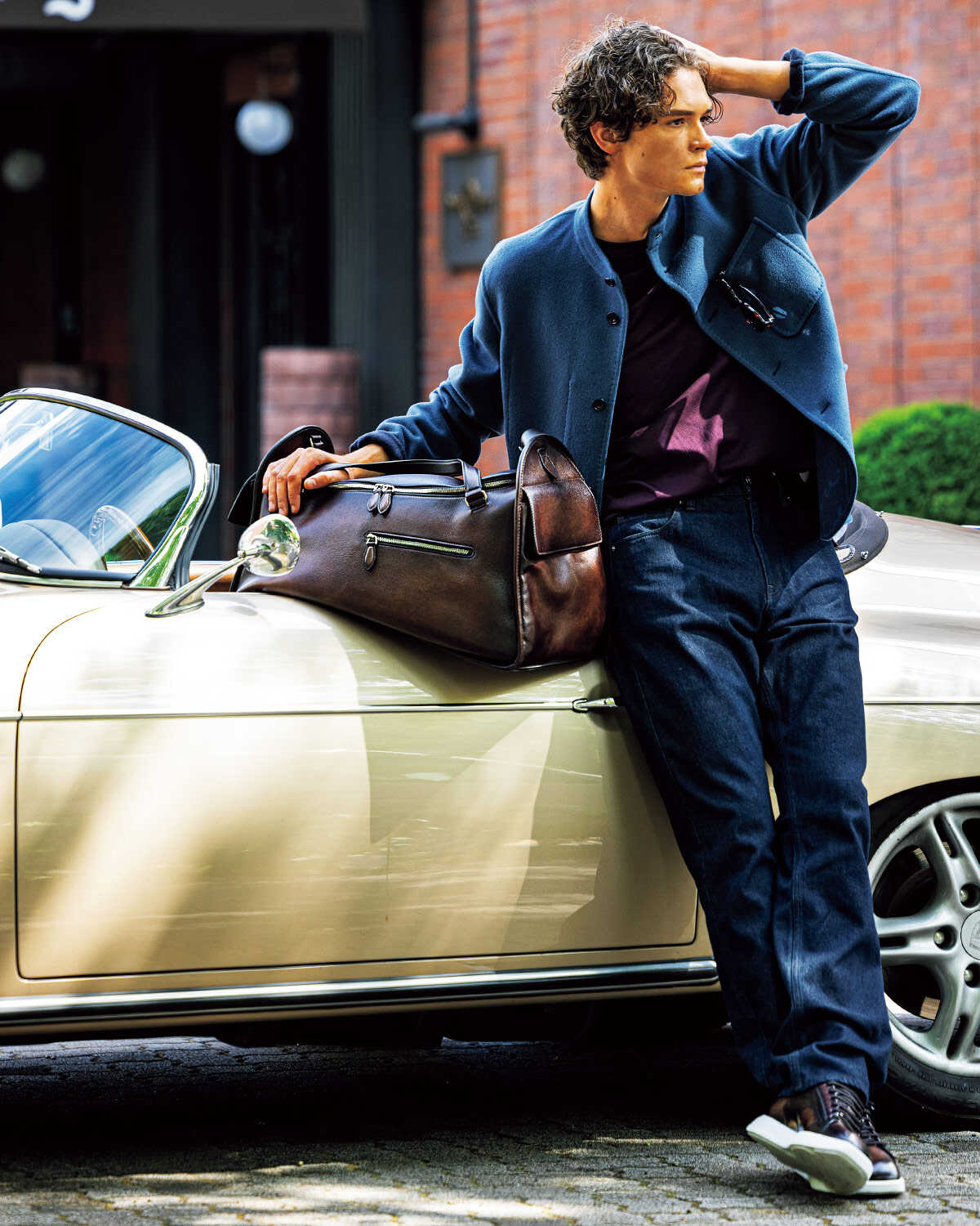 ウィークエンダーバッグ82万5000円、ジャケット53万3500円、Tシャツ7万8650円、デニムパンツ12万9800円、胸元にかけたサングラス5万2800円、スニーカー 26万2900円(以上ベルルッティ/ベルルッティ・インフォメーション・デスク)