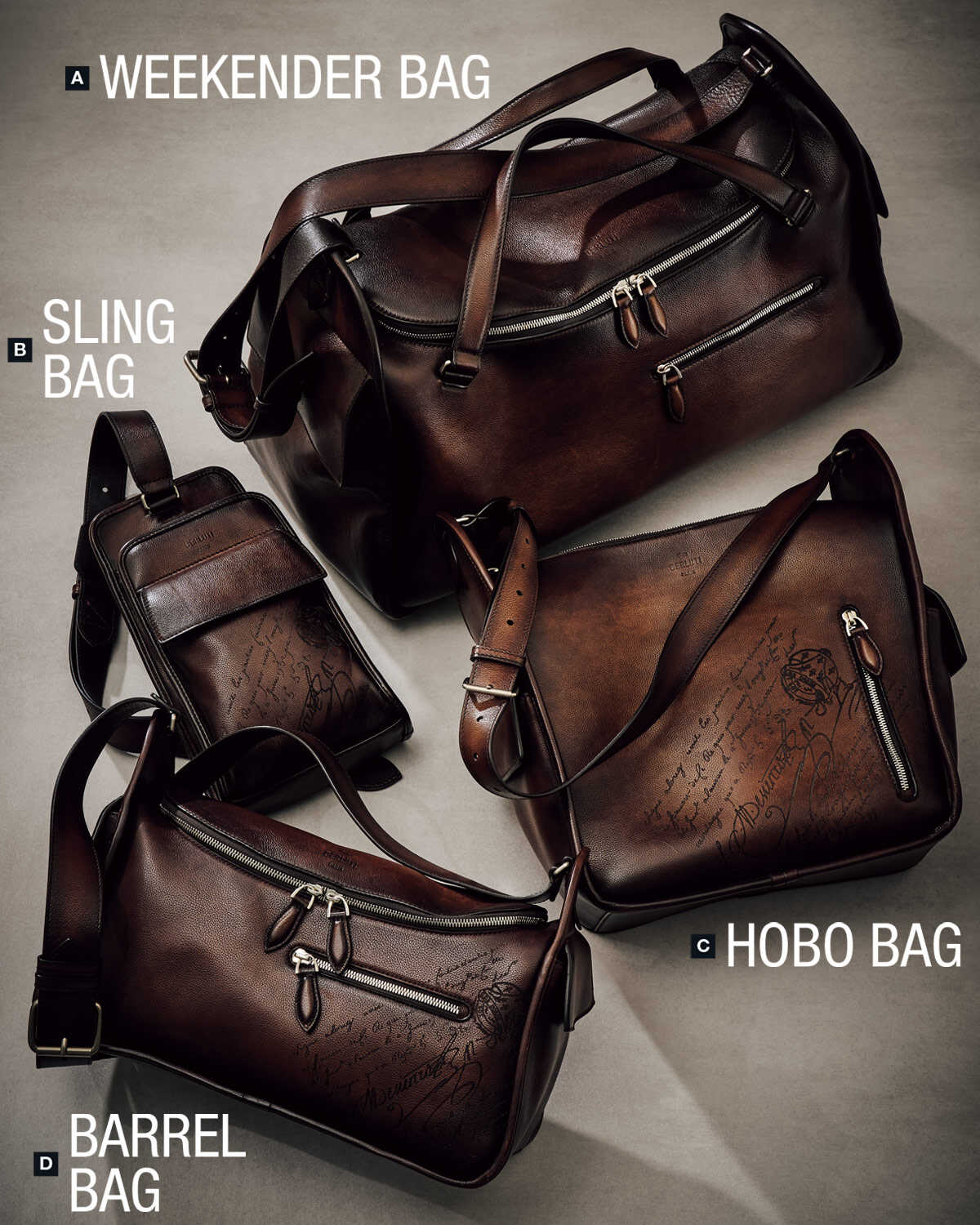 新作“ペリプル”シリーズのバッグは、どれも同じデザインコードを備える。美しく染められた“ヴェネチア ソフティレザー”は、革らしい表情のシボを残したことで、冒険にも耐えうる耐久力を備え、万一傷ついても目立ちにくい特性をもつ。また肝心の作りは、底面と側面を一体としたU字形構造と、パイピングによる仕上げのおかげで、柔らかな素材でも頑丈で美しいフォルムをキープ。さらにメインコンパートメントはコットンリネンキャンバスでライニング。頻繁に出し入れする小物の収納に便利なマグネット式フラップポケットも配し、都市を〝冒険〞する大人が使いやすい設計に。A:ウィークエンダーバッグW53×H28× D25.5cm。82万5000円 B:スリングバッグW17.5×H24×D5.5cm。40万9200円 C:ホーボーバッグW32×H27×D13.5cm。54万5600円 D:バレルバッグW17×H36×D16cm。54万5600円(以上ベルルッティ/ベルルッティ・インフォメーション・デスク)