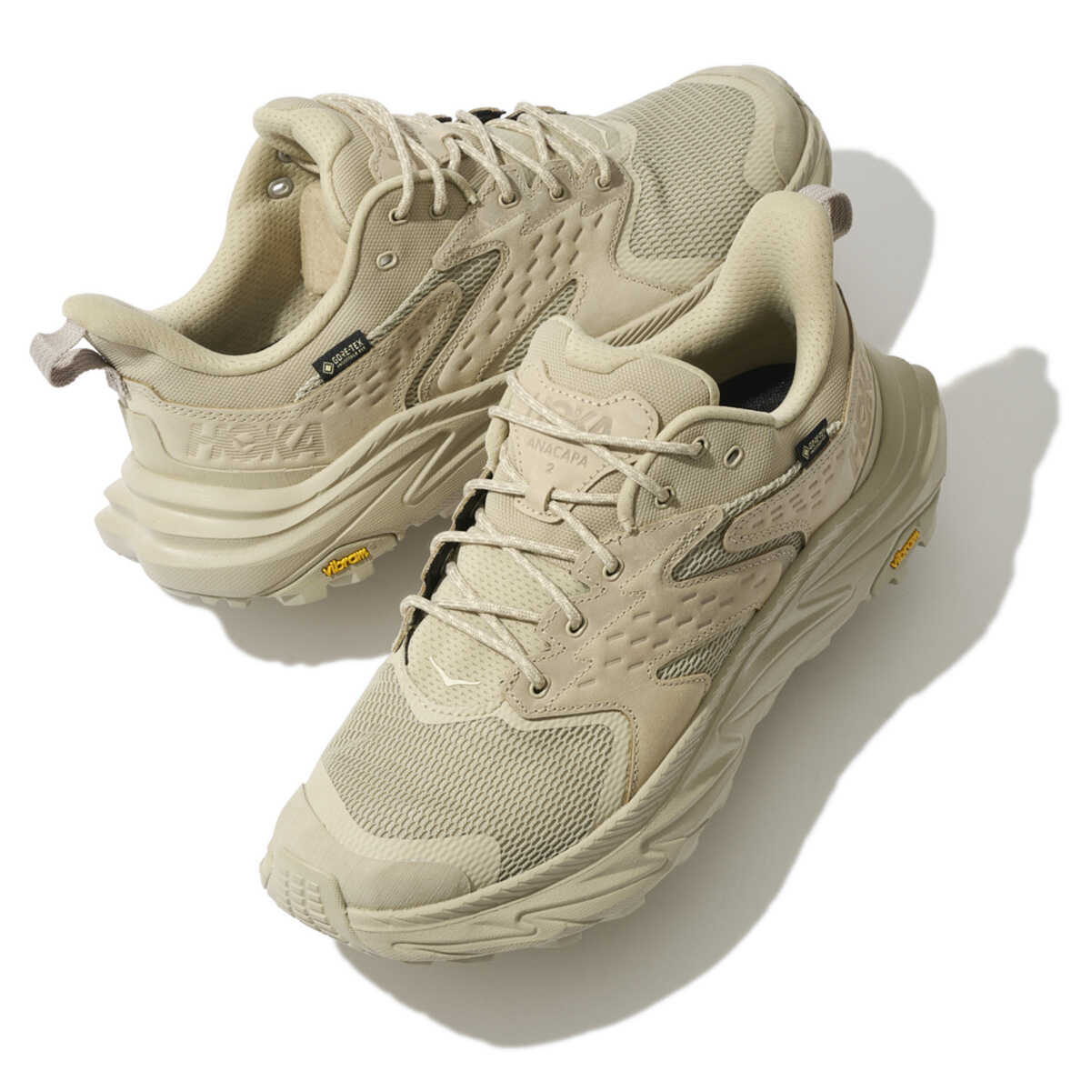 ゴアテックスやビブラムメガグリップなど、アウトドアやアクティビティに最適な作りが満載の“アナカパ 2 ロー GTX”。多くの素材をレイヤーしたアッパーデザインや迫力あるフォルムなど、スニーカーとしてのインパクトは十分。それでいてベージュの印象から、大人の優しさや貫禄も醸し出せる。元々は外遊び特化の1足なだけに、環境配慮も完璧。