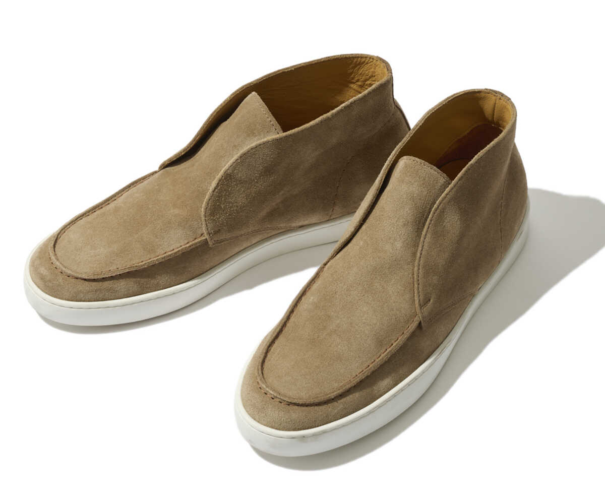 チャッカブーツのようなスタイルを、ハイカットスニーカー仕立てにした1足。ゆえに品のいい足元作りに効果絶大。シューレースのないスリッポン風のデザインで、脱ぎ履きも簡単。デイリーユースしやすいのが特徴だ。上品で優しげな印象を演出するのに格好なスウェード×ベージュトーンという組み合わせが魅力。