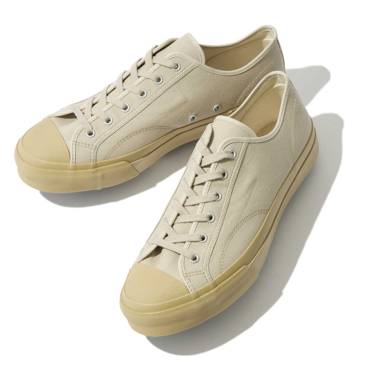 1970年代の運動靴をルーツにしたクラシカルなモデル“ロートレーナー”。ハト目や当て布など、強度が必要な運動靴ならではのディテールをしっかりと再現。ほどよくシャープなフォルムにナチュラルでニュアンスのあるトーンは、合わせるパンツを選ばず履けるのも嬉しいが、今どき感を出すならちょっと太めなカーキの軍パンとのコンビがおすすめ。