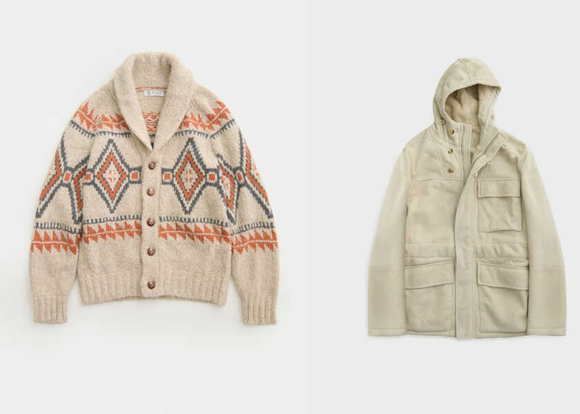 ■メンズアイテム左:ニットアウター 86万6800円(ブルネロ クチネリ/ブルネロ クチネリ ジャパン)右:シェアリングムートン・アウター 243万5400円(ブルネロ クチネリ/ブルネロ クチネリ ジャパン)