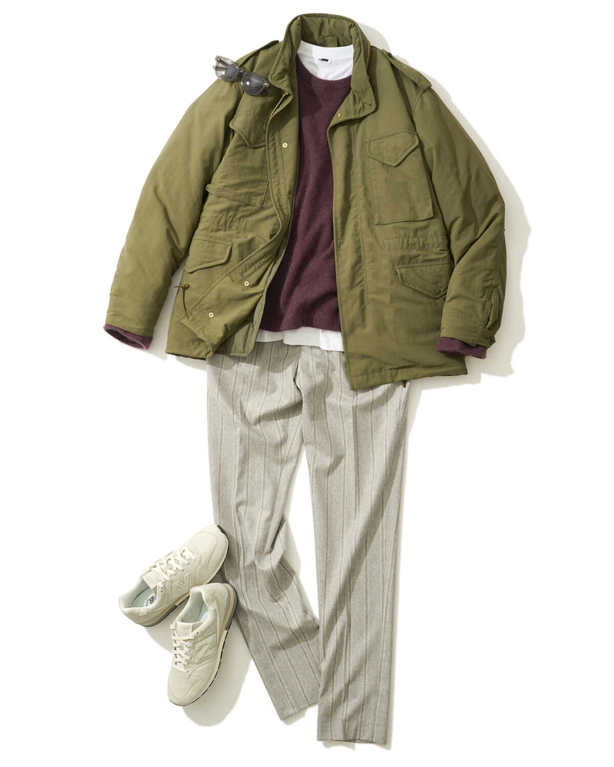 今季新作を見る前に、着こなしポイントをチェック。ご存じのとおり、男らしさを格上げしてくれるのがミリタリージャケットのメリット。ただ男クサくなりすぎると、大人っぽさに欠けてしまうので注意が必要。合わせるパンツは、スラックスのような品のよさを醸せるものを選んで、ガチ感を和らげるのがイマドキだ。