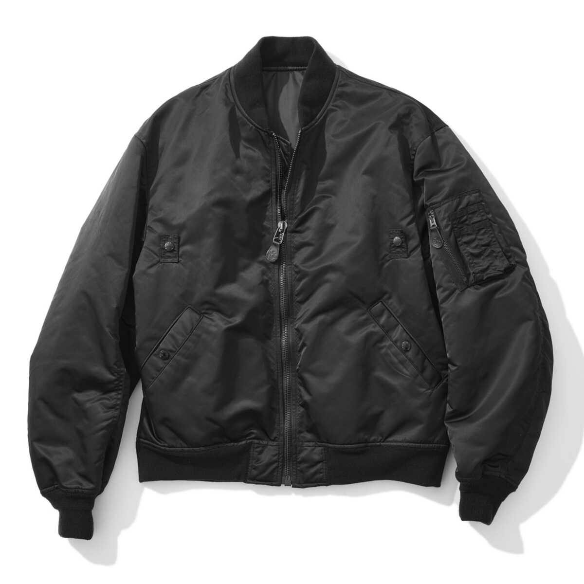 ブランドのらしさが詰まったオールブラックのナイロンジャケットは、フライトジャケットMA-1がモチーフ。腕にシガーポケットが施されているだけでなく、機内通話装置のコードや酸素マスクのホースを固定するコードループタブまで再現した本格派。モノトーン好きにはたまらない。