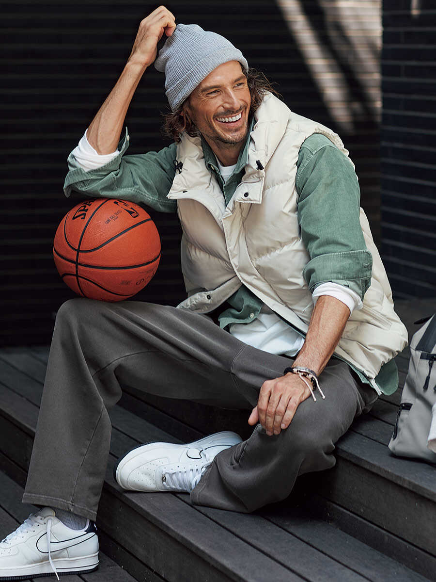 お次はカジュアルさもありつつ、渋い大人コーデを意識したスタイリング。ベースに選んだコーデュロイシャツは加工が施された1枚で、褪せ感あるグリーンが落ち着いた表情を演出してくれる。合わせたボトムはトップとまとまりやすい柔らかなトーンのグレー。そんな上下に軽やかさを出すのがメインのダウンベスト。袖がない分、アイボリーの膨張色を選んでも、ご覧のとおりすっきり!