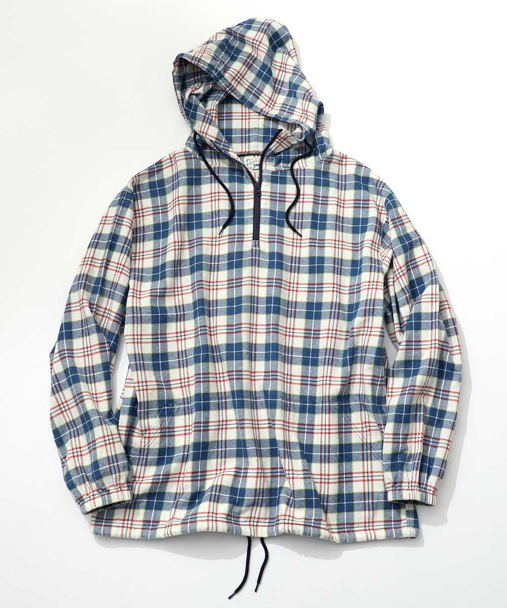チェックシャツといえばのフランネル生地で、プルオーバーパーカを仕立てた1品。ヴィンテージ加工を施したボディは、起毛感があり、抜け感とソフトで心地よい着心地を提供してくれる。さりげないハーブジップ仕様で、首元のニュアンス出しも自由自在だ。