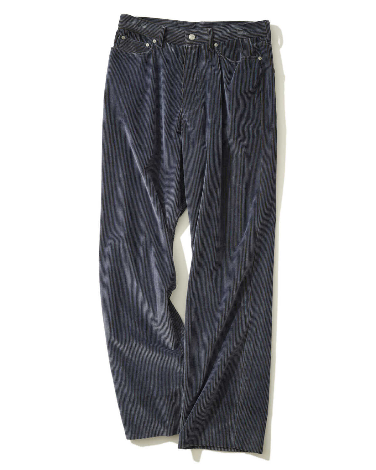 ぱっと見は、まるで長年穿きこなしたデニムのようだが、実は細畝のコーデュロイを採用し、ヴィンテージ加工を施した1本。スタイリングの主役となること請け合いなルックスは、ゆとりはありつつ決してルースではないフォルム。思い思いのこなし方を楽しめるはず。