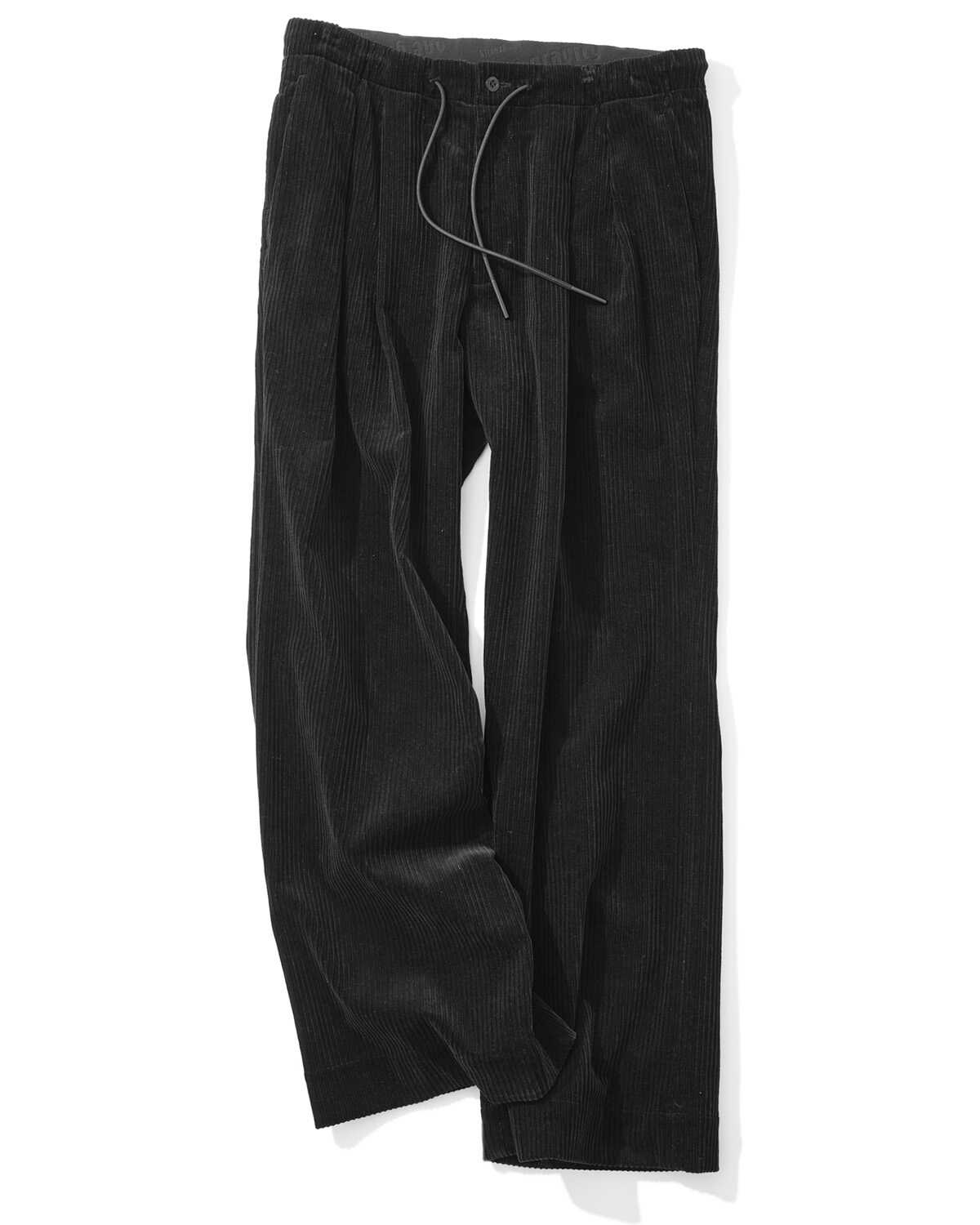 秋冬に重宝するスタイリッシュなブラックパンツも、コーデュロイ素材であれば、温かみと優しさを含んだ印象を醸すことができる。スマートながら、ウエストはドローコード仕様でリラックス感たっぷり。シルエットもゆったりでストンと落ちるようなストレート系。今どきな雰囲気で、オンにもオフにもシーンを選ばずコーデできる。