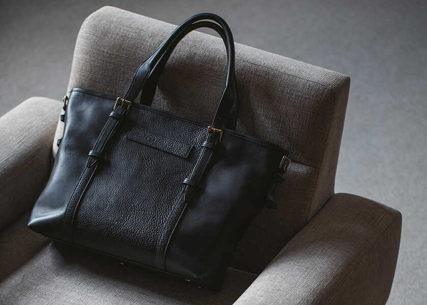 普段使いからビジネス用途まで、使用可能なMサイズのトート。口元は安心のマチ付きファスナー仕様。また、アオリポケット付き。