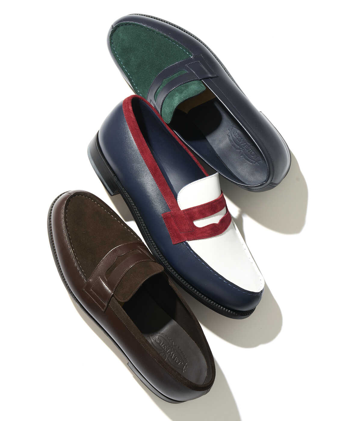 上から、ネイビー×グリーンスウェード、トリコロール、ダークブラウン×ダークブラウンスウェード。各15万6200円(以上ジェイエムウエストン/ジェイエムウエストン 青山店)
