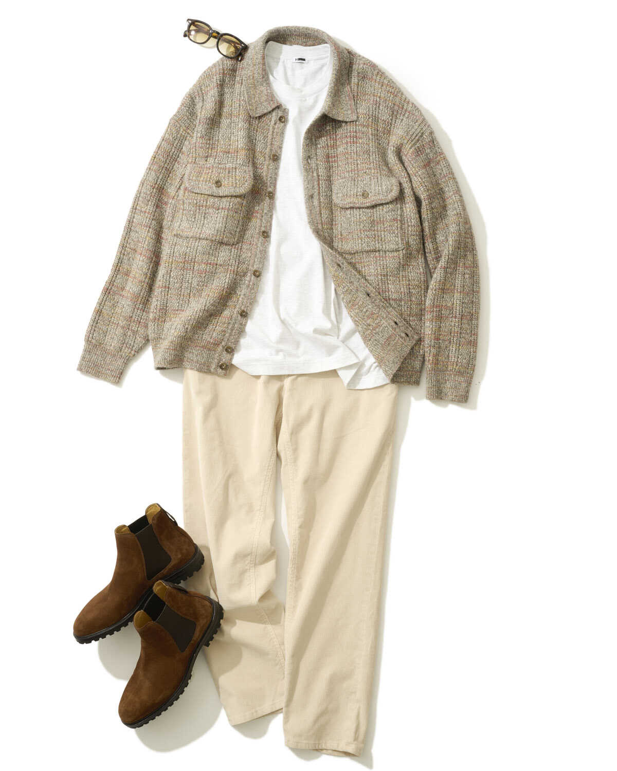 ニットトラッカージャケット3万8500円(クレプスキュール/オーバーリバー)、Tシャツ9900円(エイチ ビューティー&ユース)、コーデュロイパンツ4万7300円(PT トリノ デニム/PT ジャパン)、サングラス5万2800円(モスコット/モスコット トウキョウ)、ブーツ14万8500円(ボードイン アンド ランジ/コロネット)
