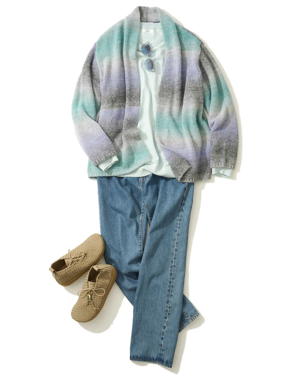 カーディガン4万7300円、スウェットシャツ3万1900円(以上ロンハーマン)、デニムパンツ1万4300円(リーバイス/リーバイ・ストラウス ジャパン)、サングラス5万2800円(モスコット/モスコット トウキョウ)、シューズ1万9800円(マリブサンダルズ/シードコーポレーション)