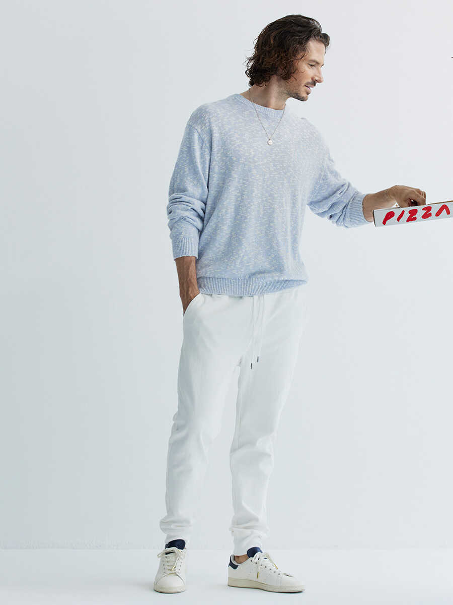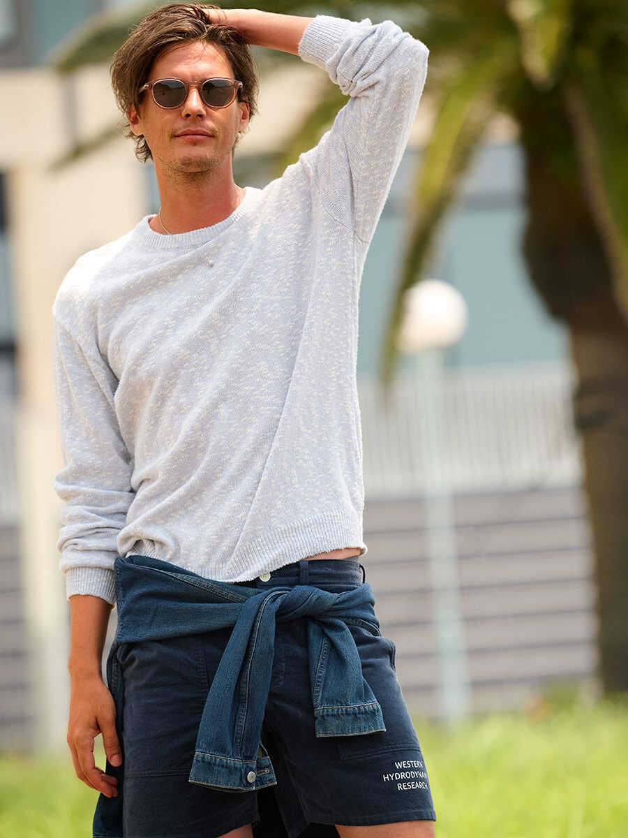 コットンとリネンを混紡したメランジ糸で編み立てたクルーネックニットは、まるで薄手のロンTのような仕上がり。生地感のおかげで、これ1枚でこなれ感出しが叶い、残暑も快適にすごせるのが嬉しい。グレー寄りなライトブルーが爽やかな清潔感を運んでくれる。