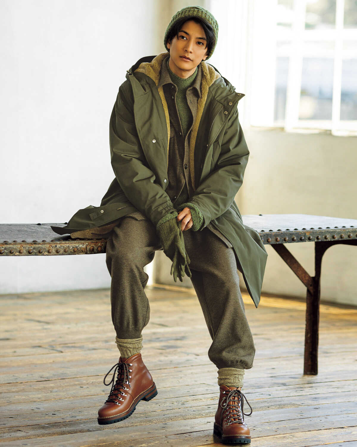 「帰省して地元の仲間と過ごすことが一番です。友人たちと1年の出来事を他愛もなく語り合う。年越しも、同じ仲間とコテージに集まって過ごすのが恒例です。雪深いエリアなので、アウトドア仕様のテック素材が重宝します。今回の〈ロロ・ピアーナ〉のアウターにもテック加工の施されているものがあるそうですね。太めのパンツや大きなポケットも好きなディテールで、こんな服で友人とのひとときを過ごせたら、より気分を盛り上げてくれそうです」