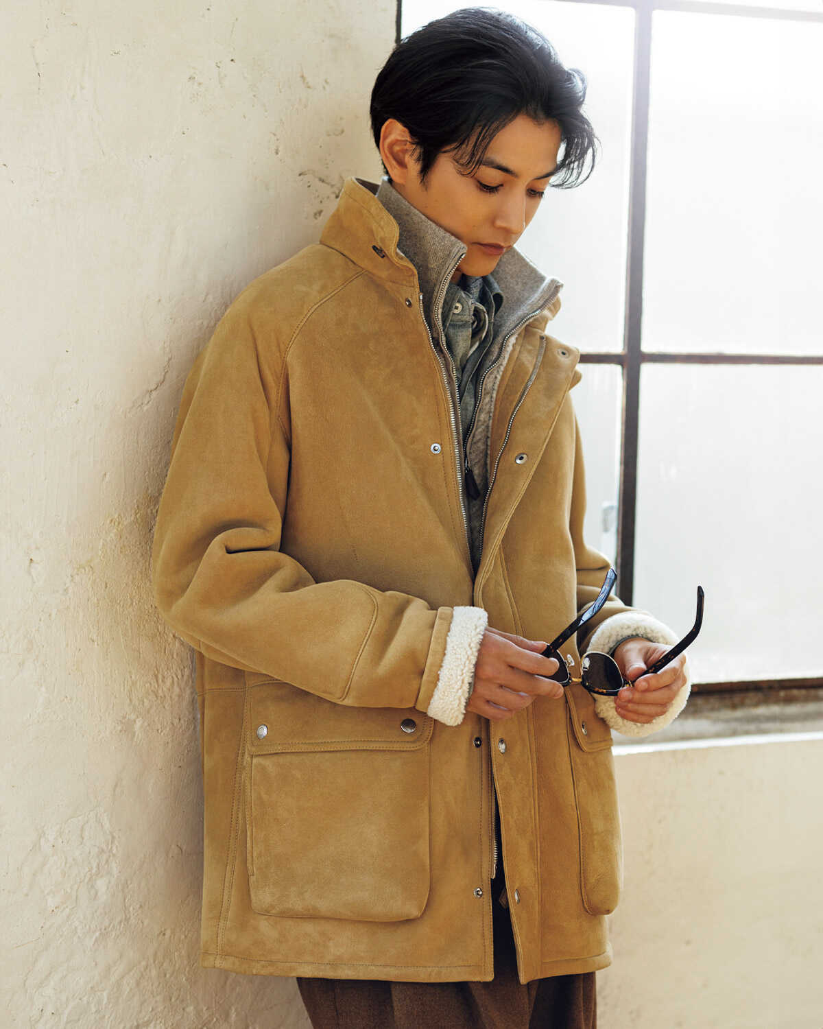 スペイン産メリノ羊のカーリーシアリングを使用したスウェードコートは、ラグランスリーブのゆったりしたサイズ感。革本来の質感を感じられるマットなナッパレザーの表面には、撥水加工が施されている。大きめのスタンドカラーや、たっぷりサイズのマチ付きポケットなど、凝ったディテールも魅力。開閉はフロントの隠しジッパーで。175万4500円(ロロ・ピアーナ/ロロ・ピアーナ ジャパン)