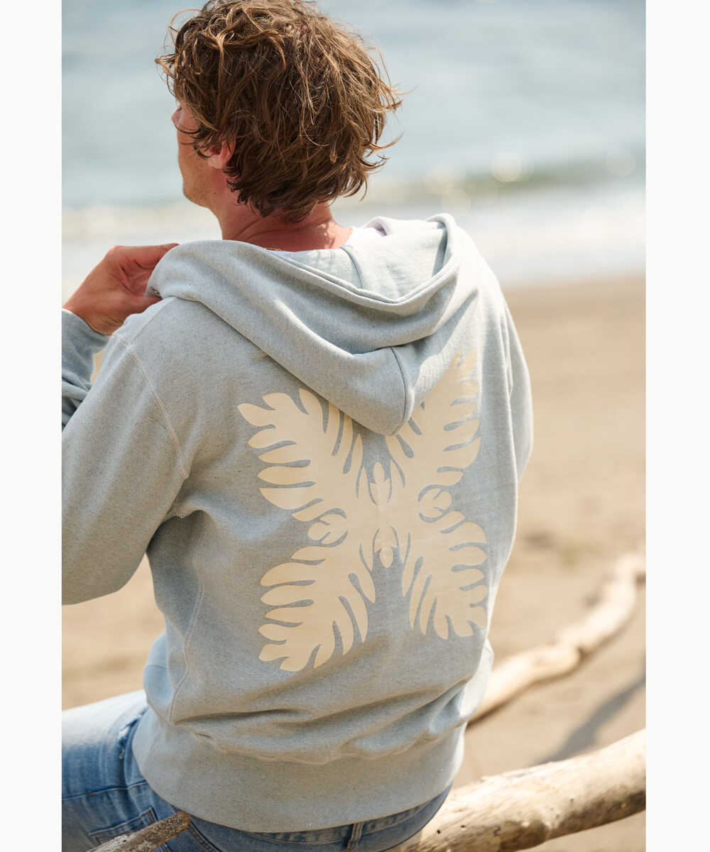 胸のロゴはあえて控えめな刺繍にして大人っぽさを演出。バックのプリントは、このブランドでもお馴染みの"ラウアエ"。ハワイを代表する花の柄はシンプルなホワイトで、青味ある生地との組み合わせを考えている。また裏起毛ではなく、裏毛なのもポイント。動くと意外と暑くなるこの秋口にちょうどいい薄さってわけ!