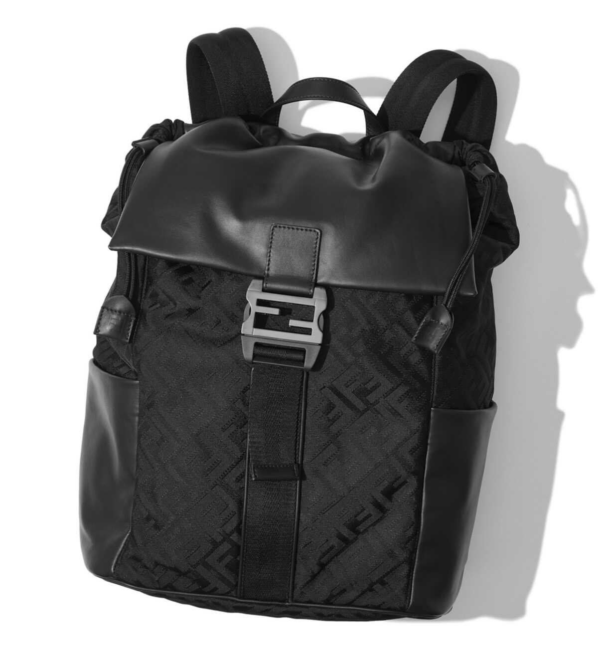 一見、無地の黒リュックだが、フロントにはパディング入り“FF”ロゴナイロン、フラップにはスムースカーフレザーを使い、格上感を演出。さらに“FF”ロゴモチーフのメタルバックルをあしらい、さりげなラグジュアリー感を発揮。背中に当たる部分はメッシュ仕様。ショルダーストラップにもパッドが入っており、快適な背負い心地にこだわっているのも見逃せない。