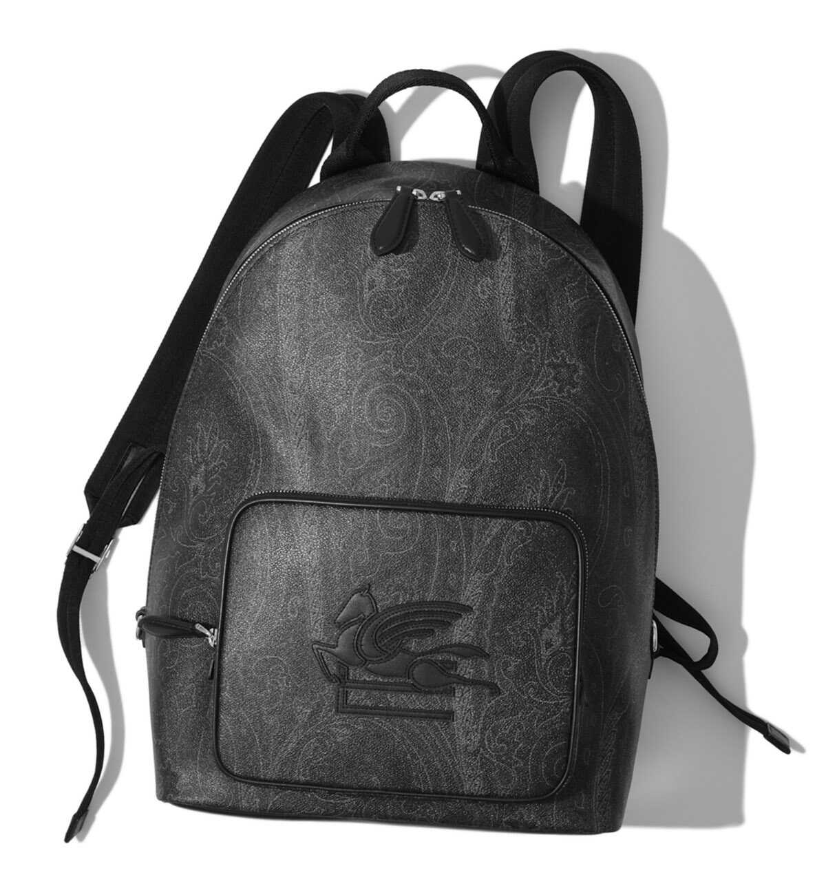 〈エトロ〉を象徴するペイズリージャカード地“アルニカ”バックパックは、シンプルな着こなしに、背中から大人の渋さとエレガントな表情を醸すのにぴったり。全体に柄が入ってはいるが黒の同系色でまとまっており、さらにミニマルに徹したデザインのおかげで、落ち着いた印象に。フロントには同じくアイコニックな“ペガソ”モチーフが刺繍されており、こちらも洗練された雰囲気を後押ししてくれる。